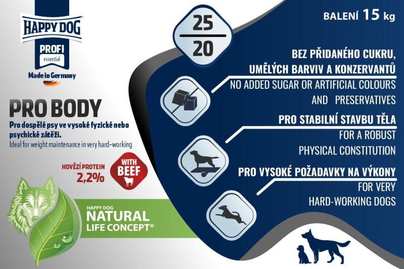Špeciálne kompletné krmivo Happy Dog Profi Essential Pro Body 25/20 s cennými ingredienciami z bavorskej prírody vám ponúka toľko potrebnú špeciálnu výživu pre psov vo vysokej fyzickej alebo psychickej záťaži. Pri striedmom obsahu 25% proteínov prináša zámerne zvýšený 20% obsah tukov. Tento vysoký obsah tukov poskytuje fyzicky veľmi aktívnym psom alebo nervóznym psom dostatok energie na pokrytie ich zvýšených potrieb energie bez toho, aby schudli vďaka odbúravaniu kostrového svalstva. Táto upravená receptúra je preto ideálna na udržanie dobrého výživného stavu a výkonného kostrového svalstva. Striedme množstvo bielkovín pritom zaisťuje dostatočnú obnovu spotrebovaných telových a krvných bielkovín. A tráviaci aparát a obličky psa sú potom zaťažené len minimálnou mierou. Chrumkavé granule prinášajú vysoko kvalitné stavebné bielkoviny z lahodnej hydiny, hovädzieho a chutných rýb, a tiež zdravé regionálne celozrnné obilniny (kukurica, ryža). Hydinové a hovädzie mäso dodáva vysoko kvalitné živočíšne bielkoviny a živočíšne a rastlinné tuky zase pohotovú energiu potrebnú na svalovú prácu. Regionálne obilniny patria medzi najdôležitejšie zdroje vlákniny, ktorá reguluje črevnú činnosť, zasýti a podporuje zdravé trávenie. Šetrne spracované obilie poskytuje aj mnoho vitamínov B, minerálnych látok ako je horčík, železo, selén a zinok a sú plné komplexných sacharidov. Jedinečne chutná receptúra je receptúra je zušľachtená prídavkom jedinečného Happy Dog Natural Life Concept®, ktorý poskytuje vášmu štvornohému priateľovi mnoho cenných prírodných živín pre imunitu a celkové zdravie a je obohatená aj o cenné novozélandské morské mušle (Slávka pyskatá) pre podporu kĺbov. Krmivo je možné nasadiť u všetkých pracovných a športových psov v období zvýšenej fyzickej alebo psychickej aktivity, najmä je však optimálne pre hyperaktívne a nervózne psy, u ktorých je ťažké vo výkonnostnej sezóne udržať dobrú fyzickú stavbu tela a potrebné osvalenie . Túto receptúru je možné nasadiť aj u chovných jedincov v období zvýšenej potreby živín. Krmivo obsahuje všetky potrebné minerálne látky, stopové prvky a vitamíny v množstvách a vzájomných pomeroch optimalizovaných pre vysoko zaťažené psy.