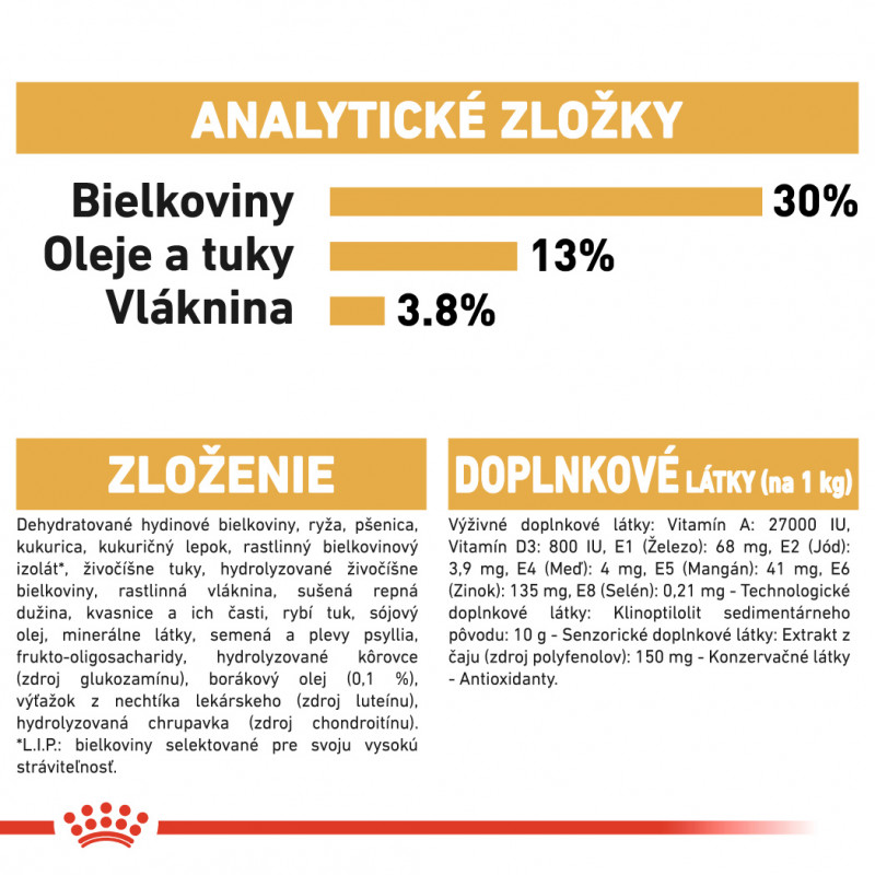 Kukurica, ryža, dehydratované hovädzie a bravčové mäso (L.I.P. – proteín vybraný vďaka svojej vysokej stráviteľnosti), dehydratované hydinové mäso, hydrolyzované živočíšne proteíny, živočíšne tuky, rastlinná vláknina, repné odrezky, kukuričný lepok, pšenica, kvasnice, rybí olej, minerály, sójový olej, šupky a semená psyllia, fruktooligosacharidy, hydrolyzované kôrovce (zdroj glukozamínu), olej z boráka lekárskeho (0,1 %), výťažok z nechtíka lekárskeho (zdroj luteínu), hydrolyzované chrupavky (zdroj chondroitínu).